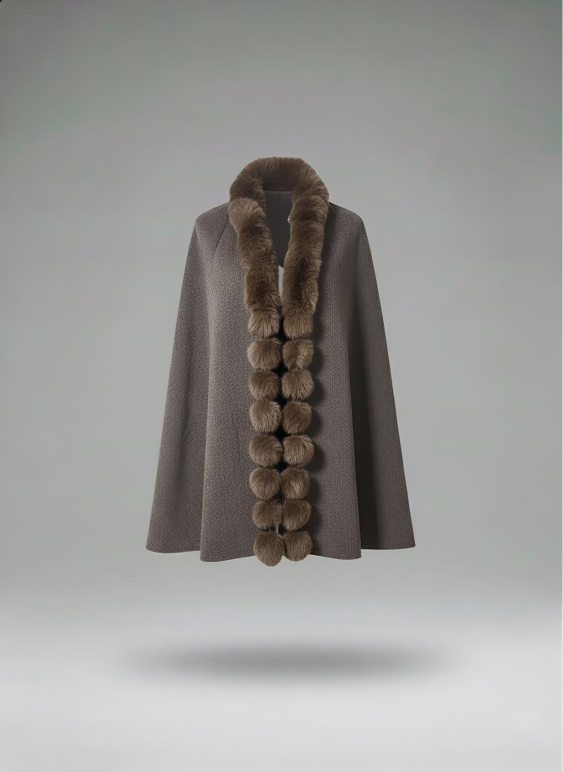 - التفاصيل المميزة: أطراف مزيّنة بالفرو وقَصّة مفتوحة بانسيابية