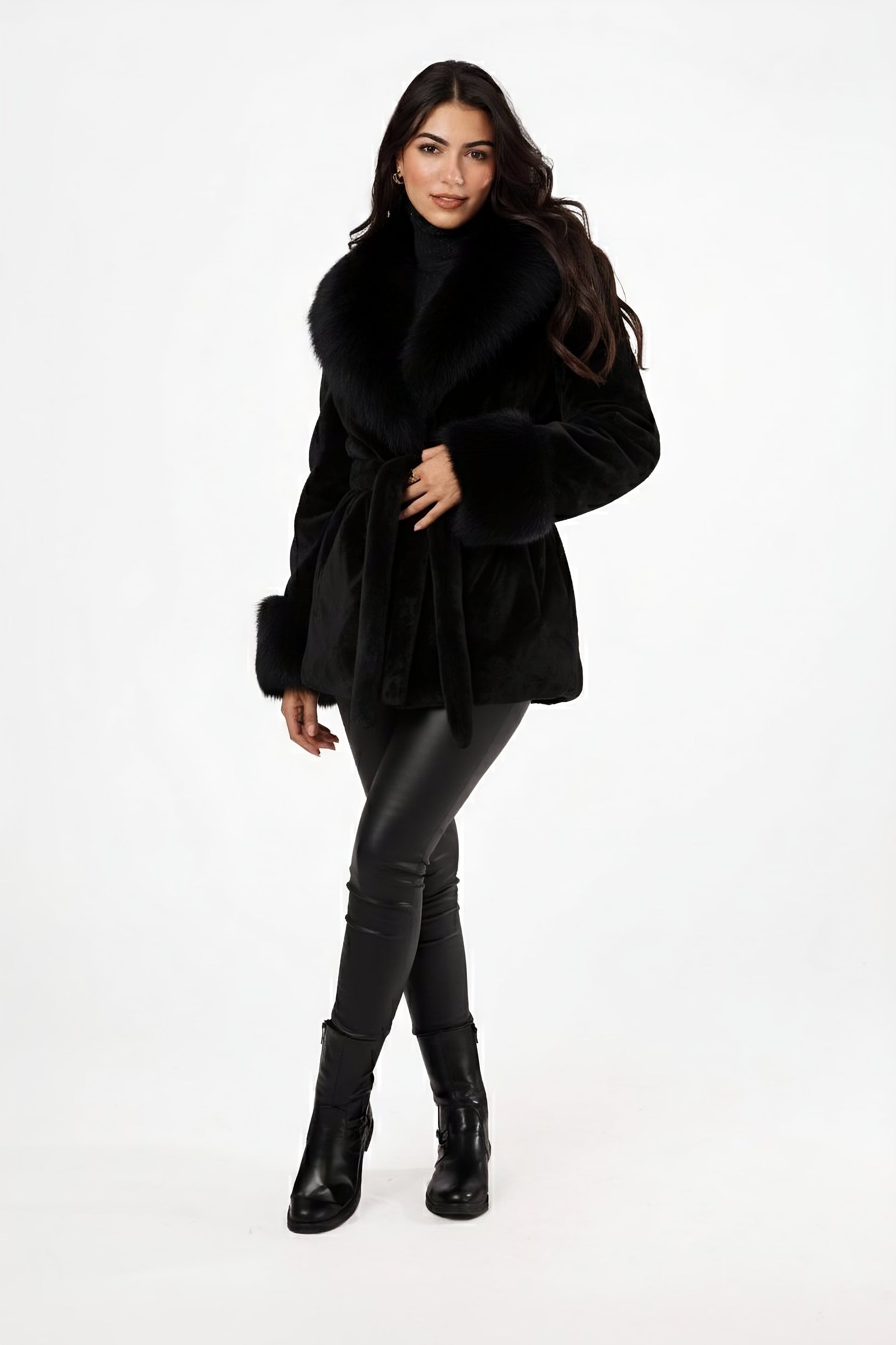 - Fabric: fur with full fur-trimmed collar and cuffs